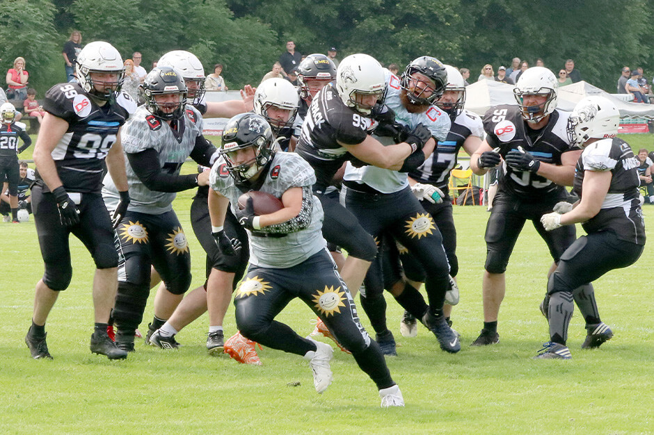 Die Gemüter der Gäste hatten sich noch nicht beruhigt, da gaben die Spieler der Wolves auf dem Feld schon die passende Antwort. Zunächst glitt Eric Renz zwar ein Ball durch die Finger, doch im dritten Versuch des gleichen Angriffs setzte Runningback René Lange seinen Körper gut in Szene und erlief seinen ersten Touchdown bei den Wolves-Herren.