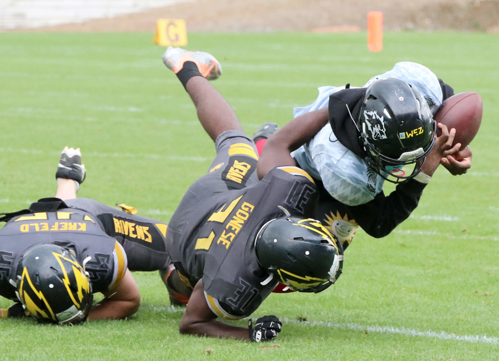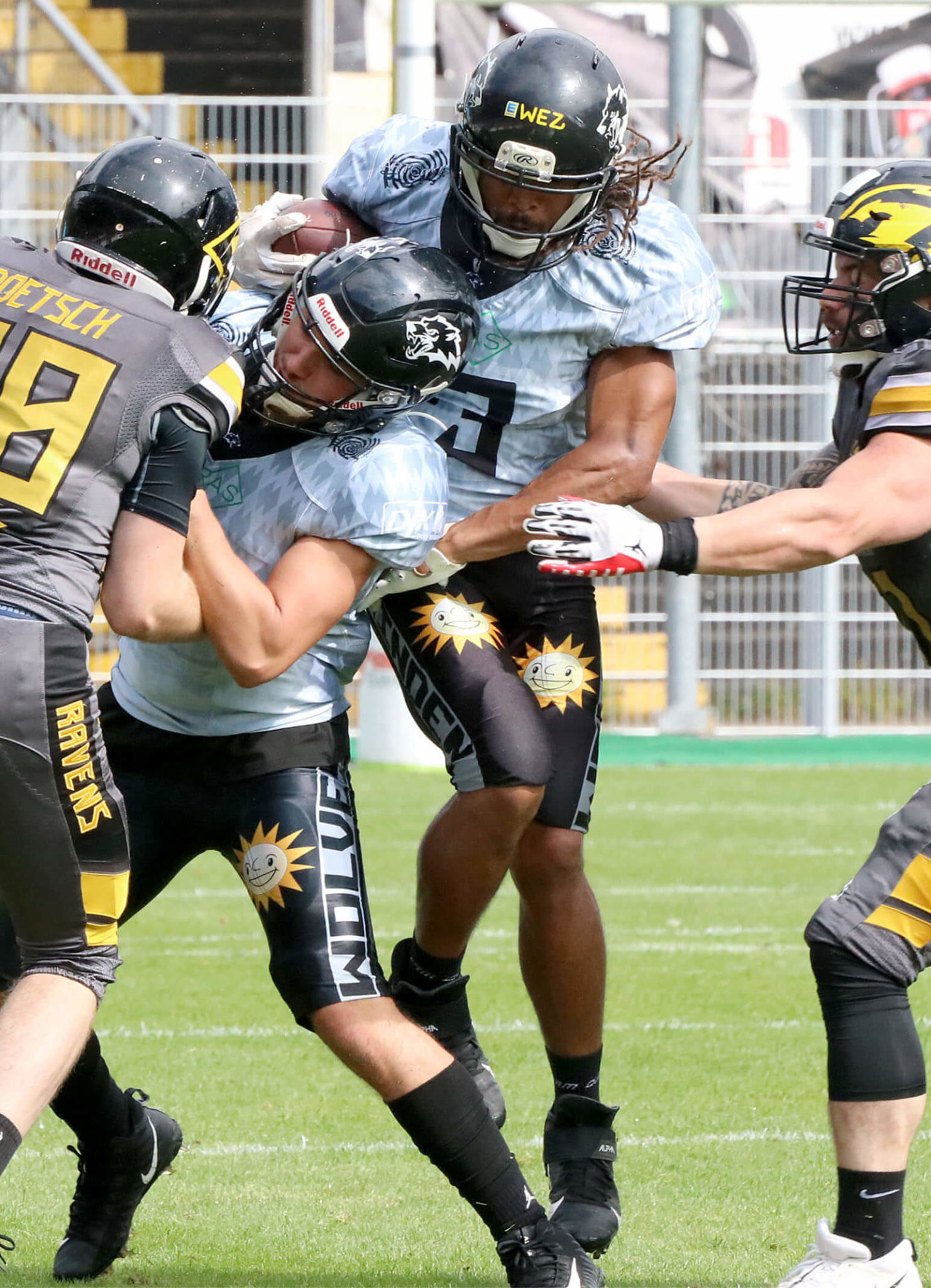 Das schwache Spiel der Minden Wolves aber nur an den Snaps festzumachen, wäre viel zu einfach. Nach Punts oder KickOffs ließ man den Krefeldern einfach viel zu viel Raum, agierte nicht, sondern reagierte, setzte zu selten zum Tackle an und wurde dadurch überlaufen – und fand den Gegner schließlich zumeist nach einem 40-, 50-Yard-Return schon weit in der eigenen Hälfte wieder. Das machte es der Ravens-Offense natürlich leichter, die Endzone zu erreichen.