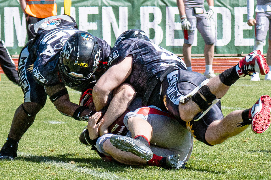 Gerade zu Beginn des Spiels war es zunächst ein offener Schlagabtausch, bei dem echte Footballfans voll auf ihre Kosten kamen. Es waren die Offensivreihen beider Mannschaften, die dabei den Ton angaben. Passend dazu, dass nach dem ersten Quarter bereits 33 Punkte auf dem Scoreboard standen. Allerdings bereits zu dem Zeitpunkt so verteilt, wie die Partie in der Folge auch weitergehen sollte. 22 für Minden, 11 für Solingen.
