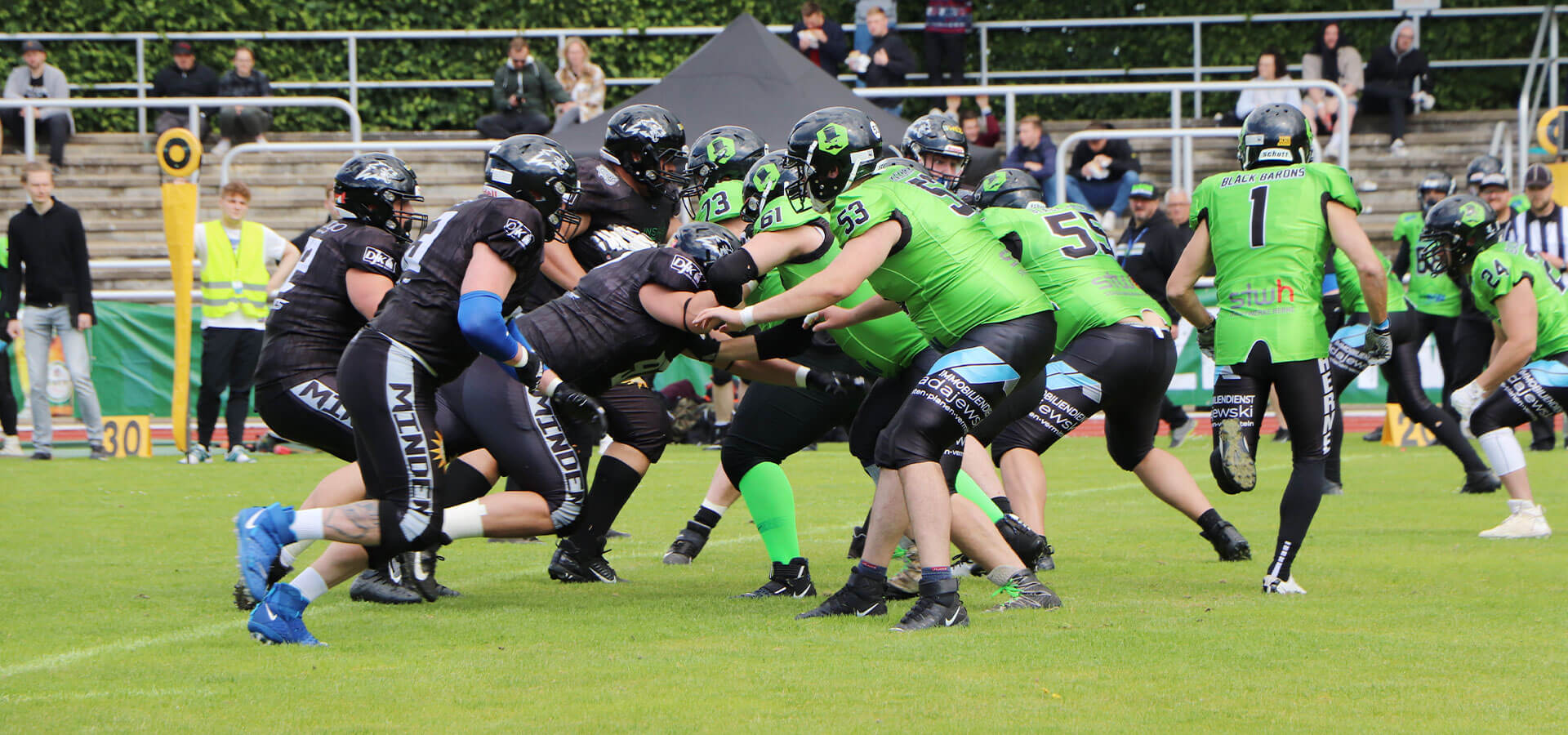 Die Minden Wolves schreiben weiter an ihrer Erfolgsgeschichte, setzen ihre Dominanz weiter fort und bezwingen nach zuvor zwei deutlichen Erfolgen als Aufsteiger in die Verbandsliga auch die Herne Black Barons im dritten Saisonspiel unangefochten mit 37:0! Damit bauen die American Footballer der DJK Dom Minden ihren Gesamtscore nicht nur auf 131:0 (!) aus, sie bleiben – das Saisoneröffnungsspiel gegen die höherklassigen Hannover Stampeders eingeschlossen – auch im vierten Duell in Folge ohne jeden gegnerischen Punkt. Die Defense der Mindener macht aktuell einen überragenden Job. Dank Lippstadts Sieg über Recklinghausen grüßen die Wolves nun als Tabellenführer!