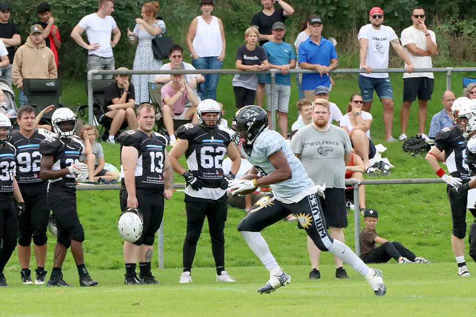 Für das heimische Wolfsrudel war es ein zäher Start in die Partie, denn erst der dritte Drive im ersten Viertel verlief rund und brachte zugleich Zählbares aufs Scoreboard. Phil Gamble, der zunächst als Quarterback agierte, lief mit dem Ball, sah den freistehenden Aymen Tlili in der Endzone und bediente ihn mit feinem Pass: Touchdown! Inklusive des PAT (Point after Touchdown) hieß es 7:0. Mehr allerdings gab es im ersten Abschnitt nicht zu bejubeln. Das lag auch daran, dass beide Defensivreihen ihren Job machten und die oftmals fehlerhafte gegnerische Offense immer wieder zum Stoppen brachten.