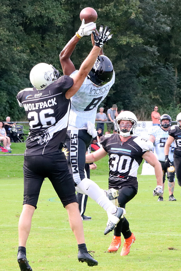 Mönchengladbach kämpfte aber darum, sich auf dem Scoreboard noch besser zu präsentieren. Und das gelang, weil die Wolves-Defense kurzfristig nicht voll im Bild war. Das nutzten die Hausherren, um im abschließenden Viertel auf 14:27 zu verkürzen. Und als sich zwei Mindener bei einem Onside-Kick des Gegners behinderten und der Ball wieder bei den Gastgebern landete, witterten die noch einmal eine Morgenluft, die Partie auf ein One-Score-Game stellen zu können. Doch diesmal stand die Defense und hielt Mönchengladbachs Angriffsbemühungen stand. Und die Mindener Offense gab anschließend genau die richtige Antwort. Mike Davis nahm den Ball an der eigenen 30 Yard-Linie auf und lief mit ihm bis auf 18 Yard vor der Endzone. Eine zu gute Ausgangsposition, als dass man sie nicht nutzen würde. Fabrice Steinbach fand mit seinem Pass Willie Fedd jr., der seinen dritten Touchdown erzielte – 33:14!