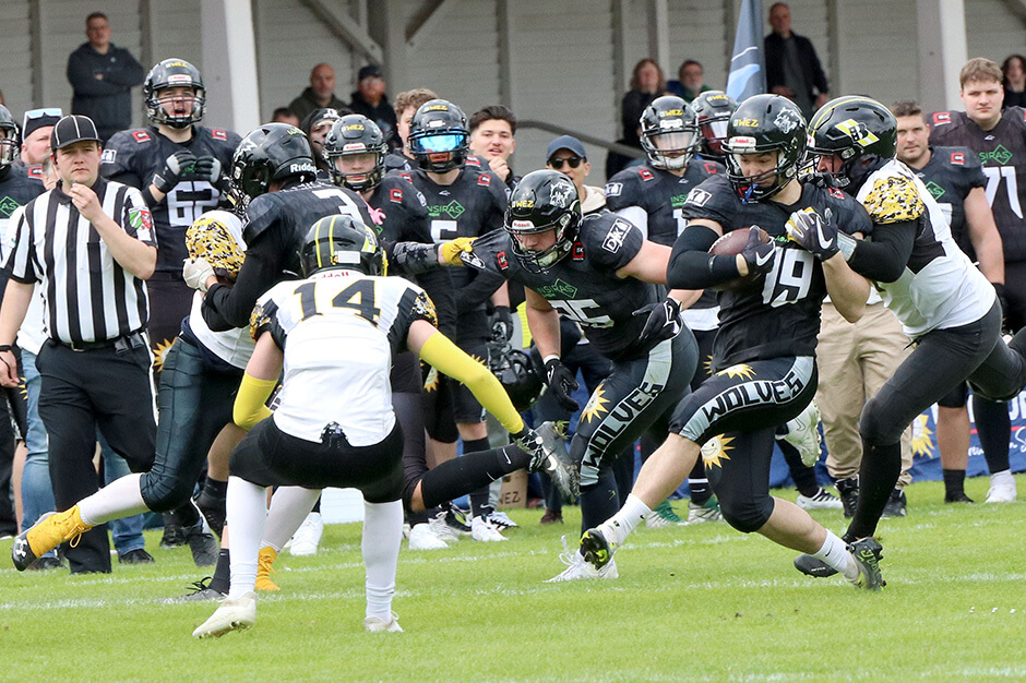 Das Spiel der Wolves beinhaltete alles, was sich ein Trainer von seinem Team wünscht. Immer wieder variierten sie mit Laufspiel durch die Mitte und über Außen, ließen die Receiver beim Passspiel den Gegner zumeist nur die Rücklichter sehen. Und fand Quarterback Fabrice Steinbach mal keine Anspielstation, erzielte er über seine Läufe so manches Yard für sein Team. Die Wolves zeigten sich gegenüber dem Saisonauftakt in Münster deutlich formverbessert. Puntreturn in die Endzone oder Interceptions, die zum Pick Six führten, ließen selbst die Spieler des Specialteams oder der Defense aufs Scoreboard kommen.