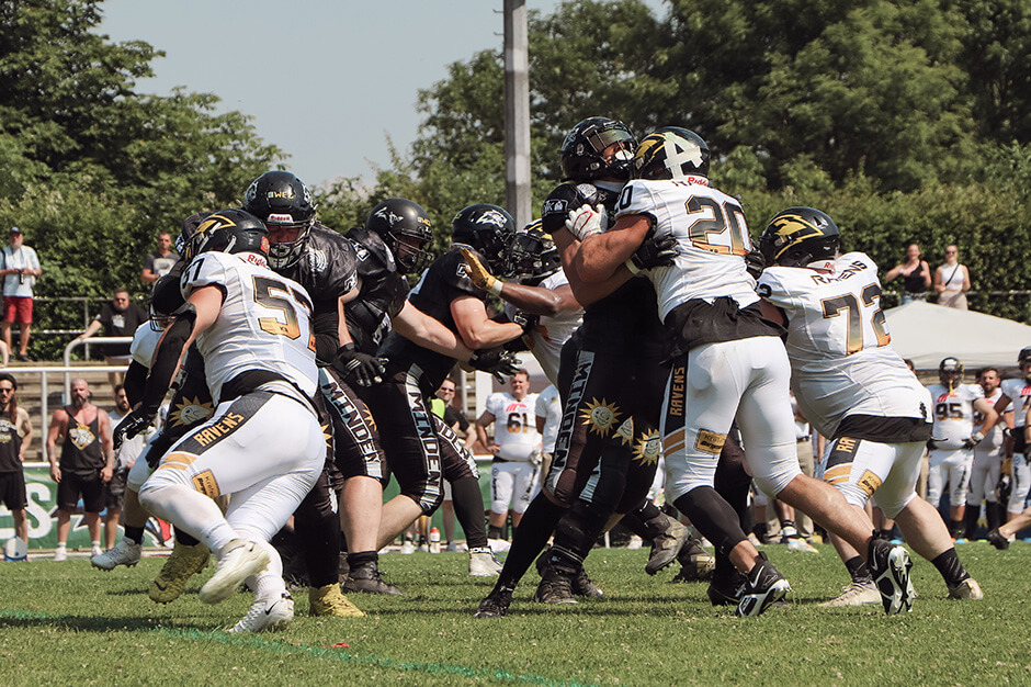 Spätestens ab dem nächsten Viertel wurde aber ein anderes Problem auf Seiten der Hausherren deutlich: die Snaps vom Center kamen nicht plaziert. In der Folge rollten sie entweder gleich über den Boden oder aber, wie im zweiten Viertel, flogen kreuz und quer durch die Gegend. Ein solcher war bei einem Punt so hoch angesetzt, dass er über Joel Bernhardt flog, der gerade noch einen Safety (2 Punkte) verhindern konnte. Allerdings kamen die Ravens an der Ein-Yard-Linie in Ballbesitz (Turnover in downs) und ließen sich nicht zweimal bitten. Der überragende Gamemaker Akiva Wedge, der zu keiner Zeit des Spiels in seinen Aktionen zu stoppen war, trug das Ei wie erwartet ins gelobte Land.